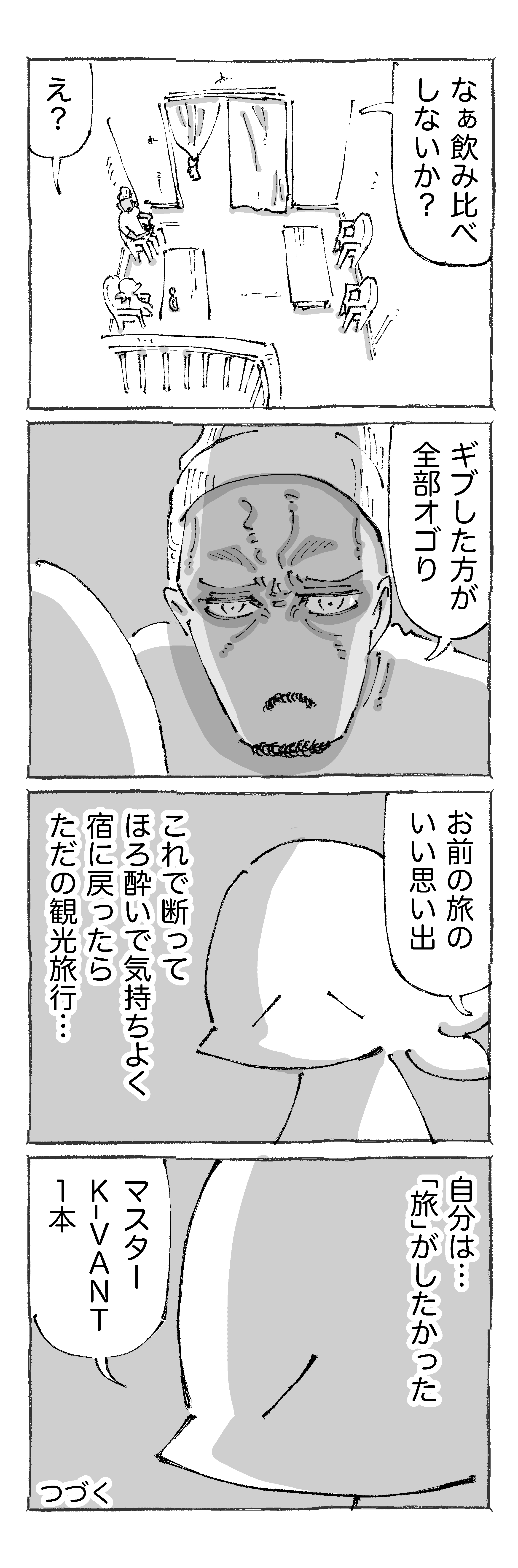 【3】海外の酒場で飲み比べ勝負になった話。 2023年06月23日 前回の【2】はこちらです✍️はじめの【1】はこちらです✍️@アフリカ明日につづきます☀︎「旅」へ。。。写真は実際のサマタと酒☀︎正真正銘の猛者。。。●漫画も写真もタップでくっきり見ていただけます☀︎つづきの【4】はこちらです✍️👇各話一覧はこちらです👇【1】 【2】 【3】 【4】【5】 【6】 【7】 【8】【9】 【10】 【11】 【12】 👇他の旅の実録もどぞ👇 🔻他の連載ものもどぞ🔻この時も勝負を感じた。。。旅日記🌏こちらは勝負を感じた飯🍜☝️読者登録して頂けるとありがたすぎます! 「連載もの」カテゴリの最新記事 タグ :#海外の酒場で飲み比べ勝負になった話。 < 前の記事次の記事 > コメント コメント一覧 (34) 1. わっか 2023年06月23日 21:03 これは気になりすぎる展開ですね… 0 五箇野人(ごかやじん) がしました 17. 五箇野人 2023年06月24日 20:25 >>1 つづきもぜひお願いします。。。 0 五箇野人(ごかやじん) がしました 2. Nyaaaaagon 2023年06月23日 21:05 飲み比べバトルの紳士の頭どーなってんの??って見てみたら… あぁ、帽子の配色の関係なのか!黒の部分が髪型に見えちゃって「ずいぶん変わった髪型だなぁ」って勝手に思い込んじゃいました(笑) 0 五箇野人(ごかやじん) がしました 18. 五箇野人 2023年06月24日 20:26 >>2 オシャレですよね☀︎ 0 五箇野人(ごかやじん) がしました 3. ミー太郎 2023年06月23日 21:11 勝負に出ましたねぇ。 顔だけで判断するとこの紳士強者そうだけど…。 0 五箇野人(ごかやじん) がしました 19. 五箇野人 2023年06月24日 20:26 >>3 ホント強者で。。。 0 五箇野人(ごかやじん) がしました 4. ぬーぴー 2023年06月23日 21:12 わー…! ゴカさん、勝負に出ましたね‼︎ ドキドキします… 0 五箇野人(ごかやじん) がしました 20. 五箇野人 2023年06月24日 20:26 >>4 ぜひつづきもお付き合いください。。。 0 五箇野人(ごかやじん) がしました 5. もっさん 2023年06月23日 21:25 アルコール度数35%…! ゴカさんの運命や如何に?! 0 五箇野人(ごかやじん) がしました 21. 五箇野人 2023年06月24日 20:27 >>5 ほんと…! 0 五箇野人(ごかやじん) がしました 6. ケニアへ 2023年06月23日 21:32 見たらわかるきついやつやん! 0 五箇野人(ごかやじん) がしました 22. 五箇野人 2023年06月24日 20:27 >>6 まさしく! 0 五箇野人(ごかやじん) がしました 7. 六花 2023年06月23日 21:44 ゴカさんの目尻が上がってる…?😆💦✨ 強者感ある紳士…お酒強そ💦 覇気?オーラ?が見えて来そう(笑) 0 五箇野人(ごかやじん) がしました 23. 五箇野人 2023年06月24日 20:27 >>7 覇気やオーラまさに。。。 0 五箇野人(ごかやじん) がしました 8. ゆきまる 2023年06月23日 21:49 ごか先生っっ!無茶しやがって!!! 0 五箇野人(ごかやじん) がしました 24. 五箇野人 2023年06月24日 20:28 >>8 やってしまいました。。。 0 五箇野人(ごかやじん) がしました 9. ジュニア 2023年06月23日 22:31 勝負師〜〜〜!! 勝ちましたよね?www 0 五箇野人(ごかやじん) がしました 25. 五箇野人 2023年06月24日 20:28 >>9 ぜひつづきもお願いします。。。 0 五箇野人(ごかやじん) がしました 10. ry 2023年06月23日 22:50 ふぉぉぉ!SAMURAI!ってなりました♡ 0 五箇野人(ごかやじん) がしました 11. ry 2023年06月23日 22:52 SAMURAI…!ってなりました♡旅路のはてやいかに 0 五箇野人(ごかやじん) がしました 26. 五箇野人 2023年06月24日 20:28 >>11 侍ありがとうございます…! 0 五箇野人(ごかやじん) がしました 12. 7 2023年06月23日 23:34 ブランデーやウィスキーのロックやストレートはよく飲んでたけど、ジンのストレートて美味しいの? でも飲み比べするなら強い酒のストレートはなるべくやめて下さい。体が心配です 0 五箇野人(ごかやじん) がしました 27. 五箇野人 2023年06月24日 20:29 >>12 ありがとうございます☀︎ 0 五箇野人(ごかやじん) がしました 13. シース 2023年06月23日 23:51 酔うの方のトリップ…笑 ひと瓶がちいさめに見えるところがより強いジンの気がします…! 0 五箇野人(ごかやじん) がしました 28. 五箇野人 2023年06月24日 20:30 >>13 トリップまさに…! 0 五箇野人(ごかやじん) がしました 14. ちゃべ 2023年06月24日 00:16 急アルにきをつけてー 0 五箇野人(ごかやじん) がしました 29. 五箇野人 2023年06月24日 20:30 >>14 ありがとうございます! 0 五箇野人(ごかやじん) がしました 15. Jun 2023年06月24日 10:57 何かオチがあるに違いない、きっとあるに違いない・・・ と期待しつつ読んでます。 0 五箇野人(ごかやじん) がしました 30. 五箇野人 2023年06月24日 20:30 >>15 ぜひつづきもお付き合いください…! 0 五箇野人(ごかやじん) がしました 16. ビセ 2023年06月24日 11:09 うぅーん地獄の予感 0 五箇野人(ごかやじん) がしました 31. 五箇野人 2023年06月24日 20:31 >>16 まさに。。。 0 五箇野人(ごかやじん) がしました 32. ナオ 2023年06月25日 21:35 ただ…ただ…かっこいい!! 0 五箇野人(ごかやじん) がしました 33. 五箇野人 2023年06月26日 20:34 >>32 ありがたすぎます…! 0 五箇野人(ごかやじん) がしました 34. 藍 2023年07月25日 07:42 五箇さんの…目の角