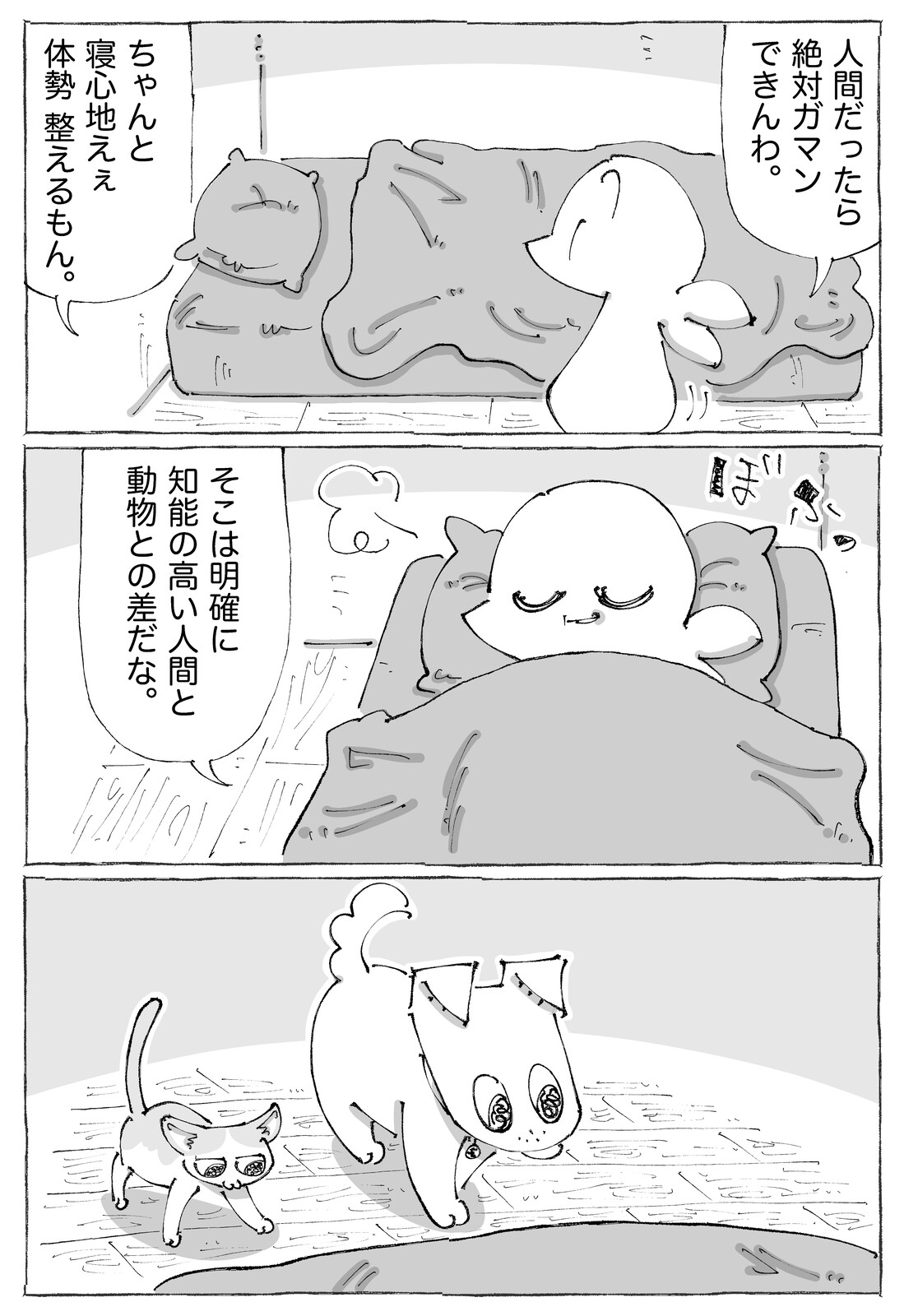 うちの犬のルカ。【84】 2026年02月08日 ●漫画はタップでくっきり見ていただけます☀︎翌朝至る所シビれ倒し☀︎●漫画はタップでくっきり見ていただけます☀︎ルカの本出とりますんでぜひぜひに☀︎🐶サンデーうぇぶりで毎週月曜更新中🐶 👇こちらもタップどうぞ👇 👇こちらもぜひです👇 👇読者登録して頂けるとありがたすぎます!👇最新刊が出たのでよろしければぜひ☀︎ 「ルカ」カテゴリの最新記事 タグ :#ルカ < 前の記事次の記事 > コメント コメント一覧 (7) 1. みー&たんじろうの母 2026年02月08日 21:15 わかります、わかります。 翌朝痺れ倒す感じが 猫が2匹、私の左右で寝てくれて、温かいのですが動くに動けない、寝返りができない でも、それも幸せです😊 0 五箇野人(ごかやじん) がしました 2. 通りすがりの旅人 2026年02月08日 21:17 ああ〰︎〰︎〰︎😭(浄化される音) もう三人まとめてきゃわわですわ! なおワイのイッヌ、抱っこしてて体勢気に入らんと降りていく… 自分の意思優先させててえらいね😉😂 0 五箇野人(ごかやじん) がしました 3. ミー太郎 2026年02月08日 21:33 わかるよ~~ ワンコもニャンコも息できるの?という体制で 寝てる時あるからねww 0 五箇野人(ごかやじん) がしました 4. 泥沼 2026年02月09日 10:47 ワンコはまだ理解出来る体勢で寝てるけど猫は 基本液体たので時々ビックリるる様な格好で寝てる。 0 五箇野人(ごかやじん) がしました 5. いぬちゃん 2026年02月09日 13:41 理解できない体勢で寝てることあるけど、最終的には ベッドとかソファとか人間よりもいい場所を陣取って ものすごい伸びて寝てる。。。🐶 0 五箇野人(ごかやじん) がしました 6. ななし 2026年02月09日 22:03 わかるわかる🤣家はちょっとでも動こうものなら苦情きます(ごくたまーーに飼い猫が布団に入ってくる) 0 五箇野人(ごかやじん) がしました 7. 🦍 2026年02月24日 03:14 嬉しそうに言ってない?♥️♥️🐶🐱♥️♥️ 0 五箇野人(ごかやじん) がしました コメントフォーム 名前 コメント 記事の評価 リセット リセット 顔 星 情報を記憶 コメントを投稿する