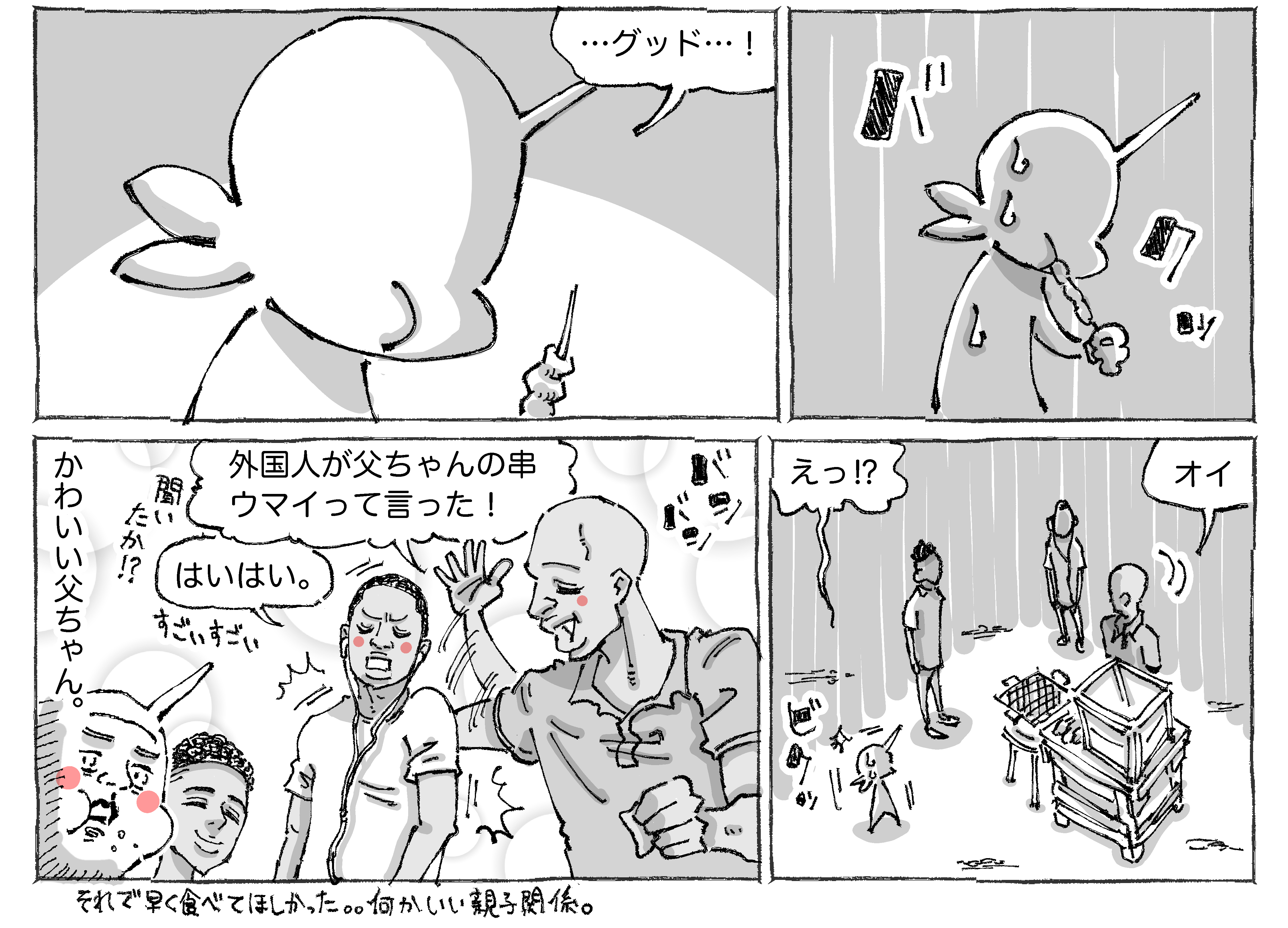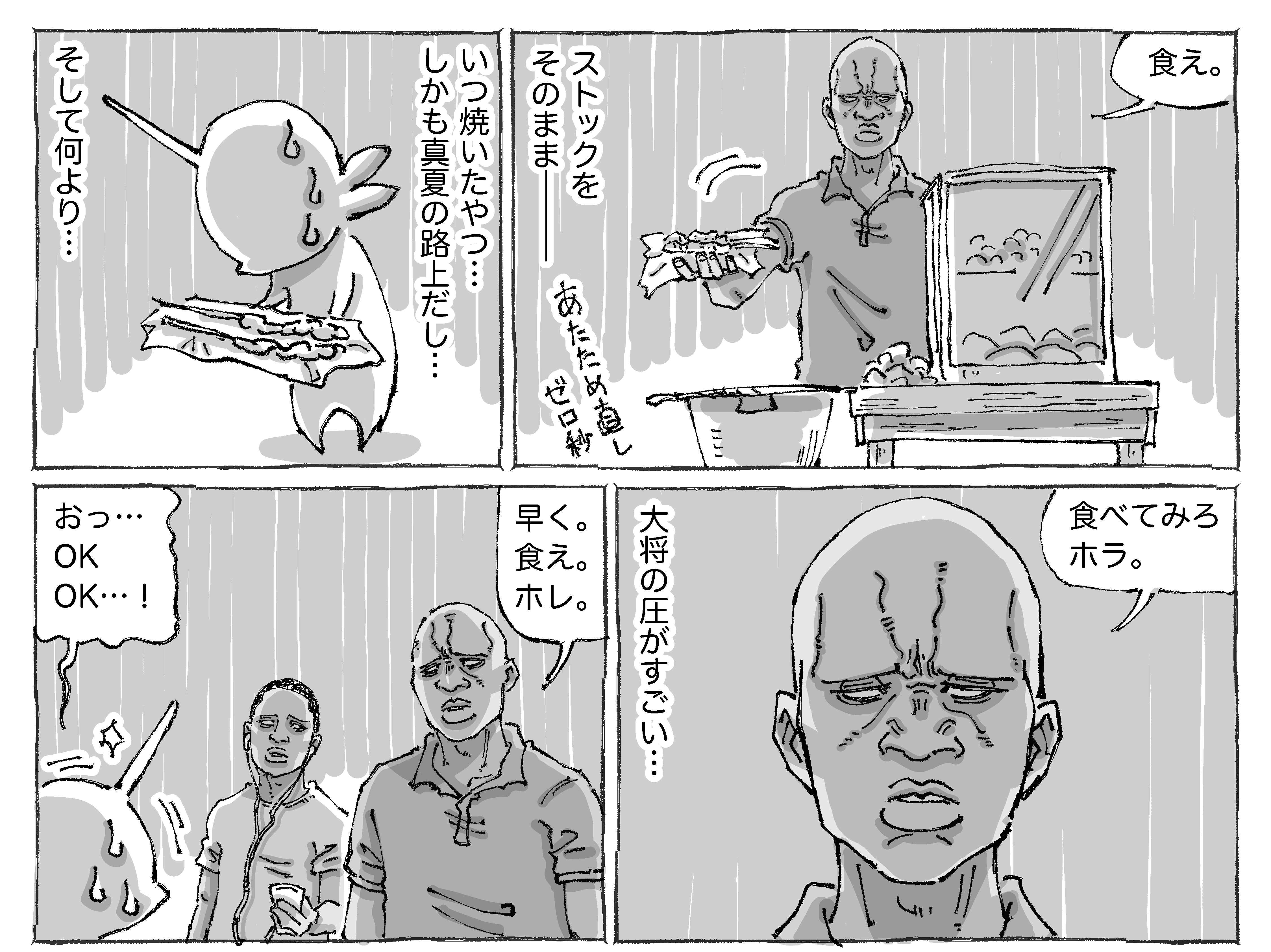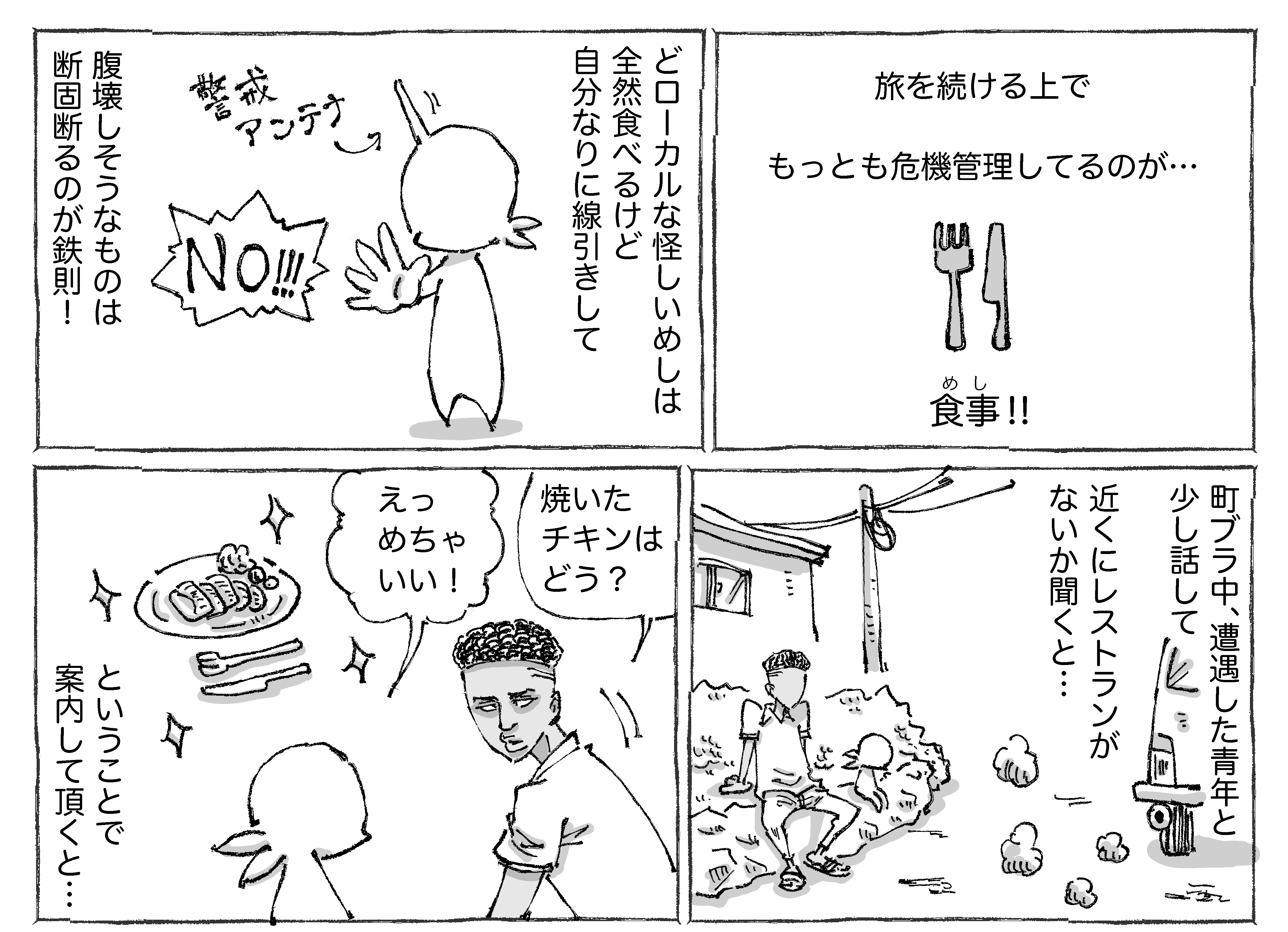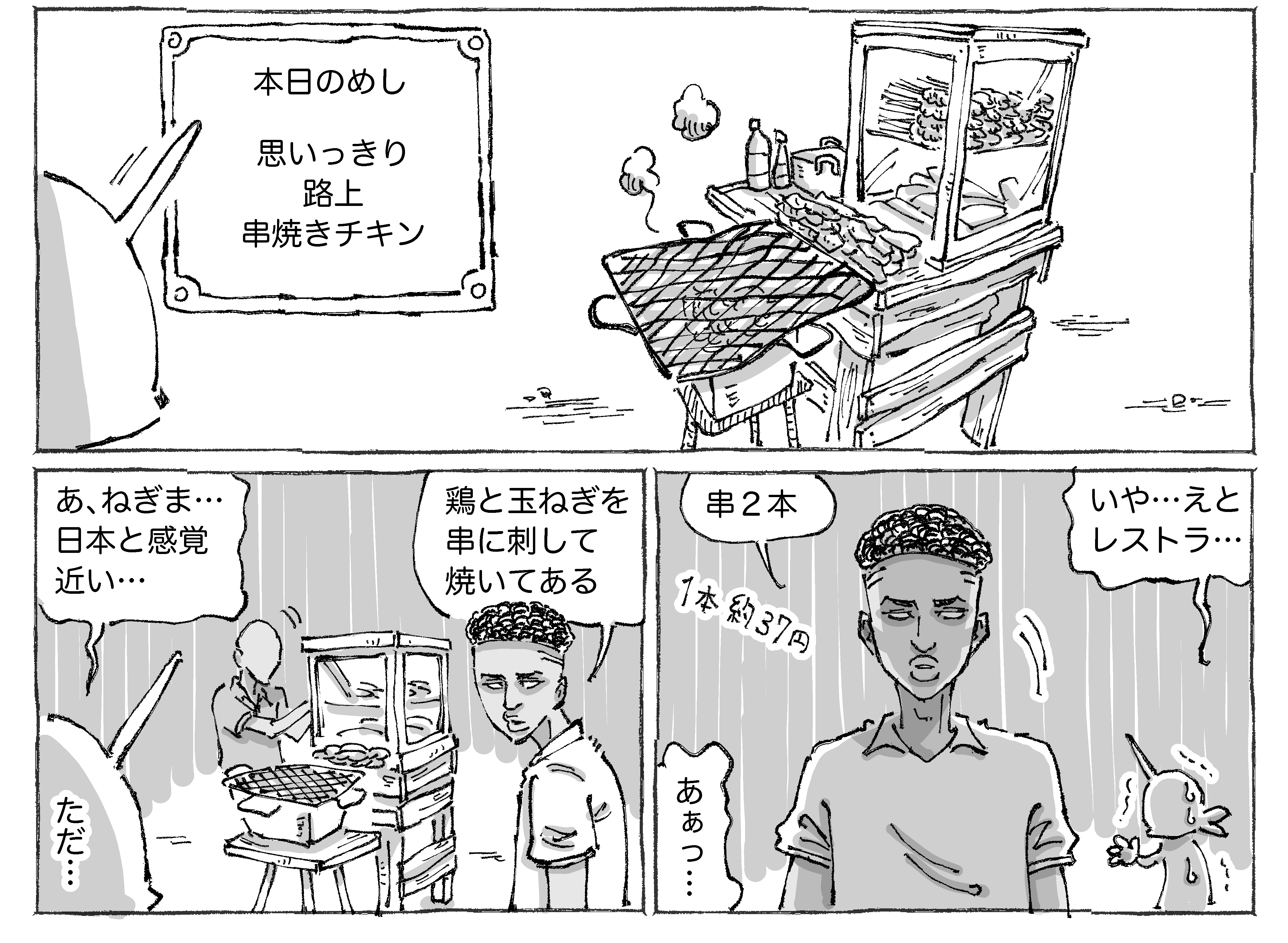 海外で出会うまさかのチキンと親子めし。 2020年11月11日 何やかんや一緒に店に出てる息子くんもいい。しっかり炭火焼だしほどよいスパイスと肉と玉ねぎが合いまくりでした。お父さんの嬉しそうな笑顔がたまりません。●漫画も写真もタップでくっきり見ていただけます☀︎ ほかのアフリカのときめいためしのおはなし✍️ほかのアフリカの始めビビらされた旅日記✍️ほかの海外のつづきもののおはなし✍️読者登録して頂けるとありがたすぎます!旅日記とシビれめしをまとめた本がでますのでよろしければぜひです☀︎📖つかれたときに読む海外旅日記 「シビれめし」カテゴリの最新記事 タグ :#アフリカめし#グルメ#家族 < 前の記事次の記事 > コメント コメント一覧 (15) 1. ゆきまる 2020年11月11日 21:08 お腹は…お腹は大丈夫だったのでしょうか??! 0 五箇野人(ごかやじん) がしました 7. 五箇野人 2020年11月12日 20:59 >>1 大丈夫でした! 0 五箇野人(ごかやじん) がしました 2. 旅行したい 2020年11月11日 21:56 結局食べちゃう♪ 0 五箇野人(ごかやじん) がしました 8. 五箇野人 2020年11月12日 20:59 >>2 ですよね☀︎ 0 五箇野人(ごかやじん) がしました 3. けるやん 2020年11月11日 22:06 いつも暖かい漫画ありがとうです。 すいません、質問です。 作者さんは英語?堪能なのですか? それとも、肌感覚で相手の話してる内容がわかるのですか? 教えて下さい。 0 五箇野人(ごかやじん) がしました 9. 五箇野人 2020年11月12日 21:01 >>3 こちらこそありがとうございます☀︎ 自分は英語少々と翻訳アプリです☀︎ 0 五箇野人(ごかやじん) がしました 4. な 2020年11月12日 00:12 あたため直しゼロ秒w 0 五箇野人(ごかやじん) がしました 10. 五箇野人 2020年11月12日 21:01 >>4 です! 0 五箇野人(ごかやじん) がしました 5. とーちゃん! 2020年11月12日 00:42 写真のとーちゃんの顔よwナイスはにかみw 肉はスパイスかけときゃなんとかなるもの…?🤔 0 五箇野人(ごかやじん) がしました 11. 五箇野人 2020年11月12日 21:02 >>5 同感です! 本当にそうかもです☀︎ 0 五箇野人(ごかやじん) がしました 6. カツミ 2020年11月12日 20:20 真夏の路上ストック… で、でも、しっかり焼けててスパイス効いてるなら だ、大丈夫(だったんですよ…ね?) 写真を見て思わず「おいしそー」と思っちゃいました! 0 五箇野人(ごかやじん) がしました 12. 五箇野人 2020年11月12日 21:03 >>6 全然大丈夫でした! 0 五箇野人(ごかやじん) がしました 13. ぐー 2021年01月07日 15:34 何肉だったんでしょうか? 見た目牛っぽいけど。 そういうのもマンガに書いて頂けるとうれしいです。 0 五箇野人(ごかやじん) がしました 14. ぐー 2021年01月07日 15:36 >>13 あー! 最初に少年がチキンって言ってますね すいませんでした 0 五箇野人(ごかやじん) がしました 15. 五箇野人 2021年01月07日 20:37 >>14 とんでもないです! 引き続き楽しんで 頂けるよう気張ります☀︎ 0 五箇野人(ごかやじん) がしました コメントフォーム 名前 コメント 記事の評価 リセット リセット 顔 星 情報を記憶 コメントを投稿する