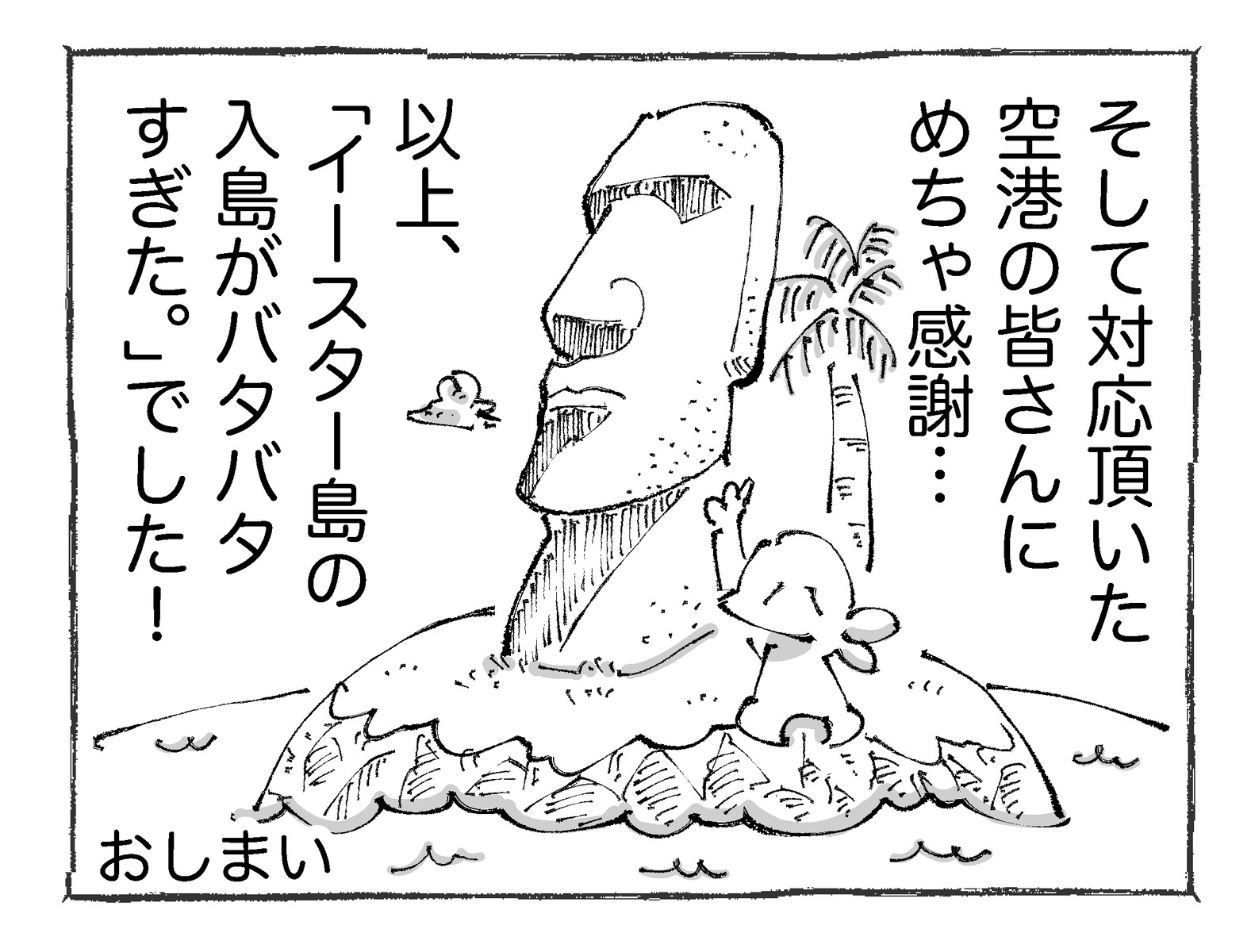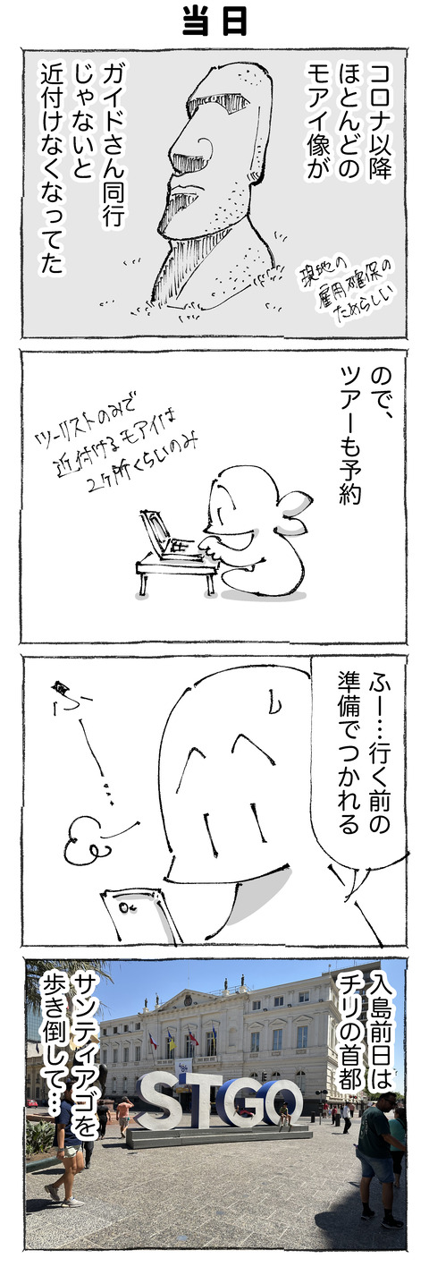 【24】最終回・イースター島の入島がバタバタすぎた。 ※連載ものは木~土に更新中です☀︎前回の【23】はこちらです✍️ はじめの【1】はこちらです✍️@中南米👇各話一覧はこちらです👇【1】 【2】 【3】 【4】【5】 【6】 【7】 【8】【9】 【10】 【11】 【12】【13】 【14】 【15】 【16】【17】 【18】 【 ... ※連載ものは木~土に更新中です☀︎前回の【23】はこちらです✍️ はじめの【1】はこちらです✍️@中南米👇各話一覧はこちらです👇【1】 【2】 【3】 【4】【5】 【6】 【7】 【8】【9】 【10】 【11】 【12】【13】 【14】 【15】 【16】【17】 【18】 【19】 【20】【21】 【22】 【23】 【24】最後までお付き合い頂きありがとうございました! 👇こちらもタップどうぞ👇ついについに!イースター島上陸!色んな偶然に恵まれまくってて全部に感謝ですわ。。。その後の話はまたの機会に☀︎●漫画も写真もタップでくっきり見ていただけます☀︎ 👇こちらもどうぞ👇 👇実体験の紀行もの👇☝️読者登録して頂けるとありがたすぎます!☝️※2024年よりLINEでの通知が終了します…! タグ :#イースター島の入島がバタバタすぎた。 2025年05月10日 続きを読む